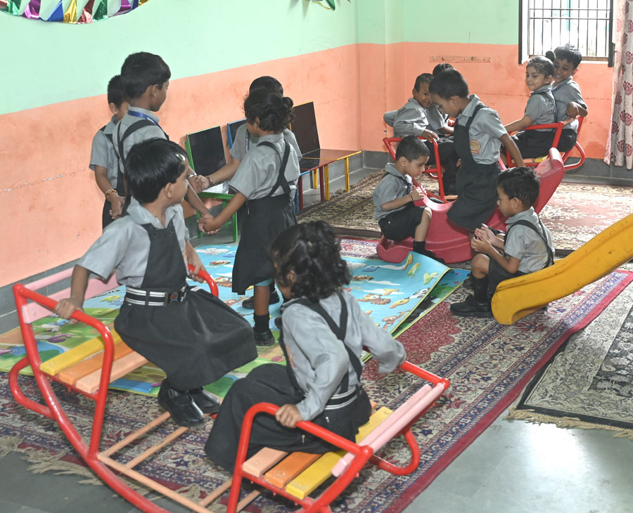 Smart class, Projector, Library , A.C Playroom for kids, Eco friendly Environment , Trained & Dedicated Teacher’s
